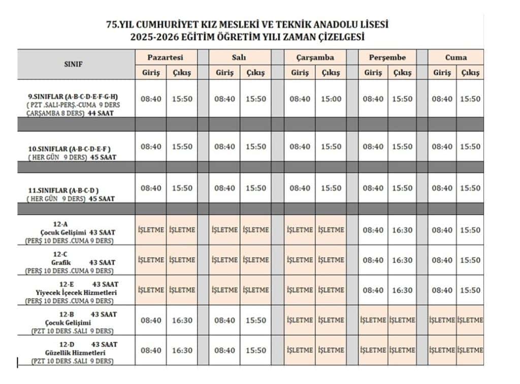 15 Eylül 2025 tarihinden itibaren geçerli ders programı aşağıda...